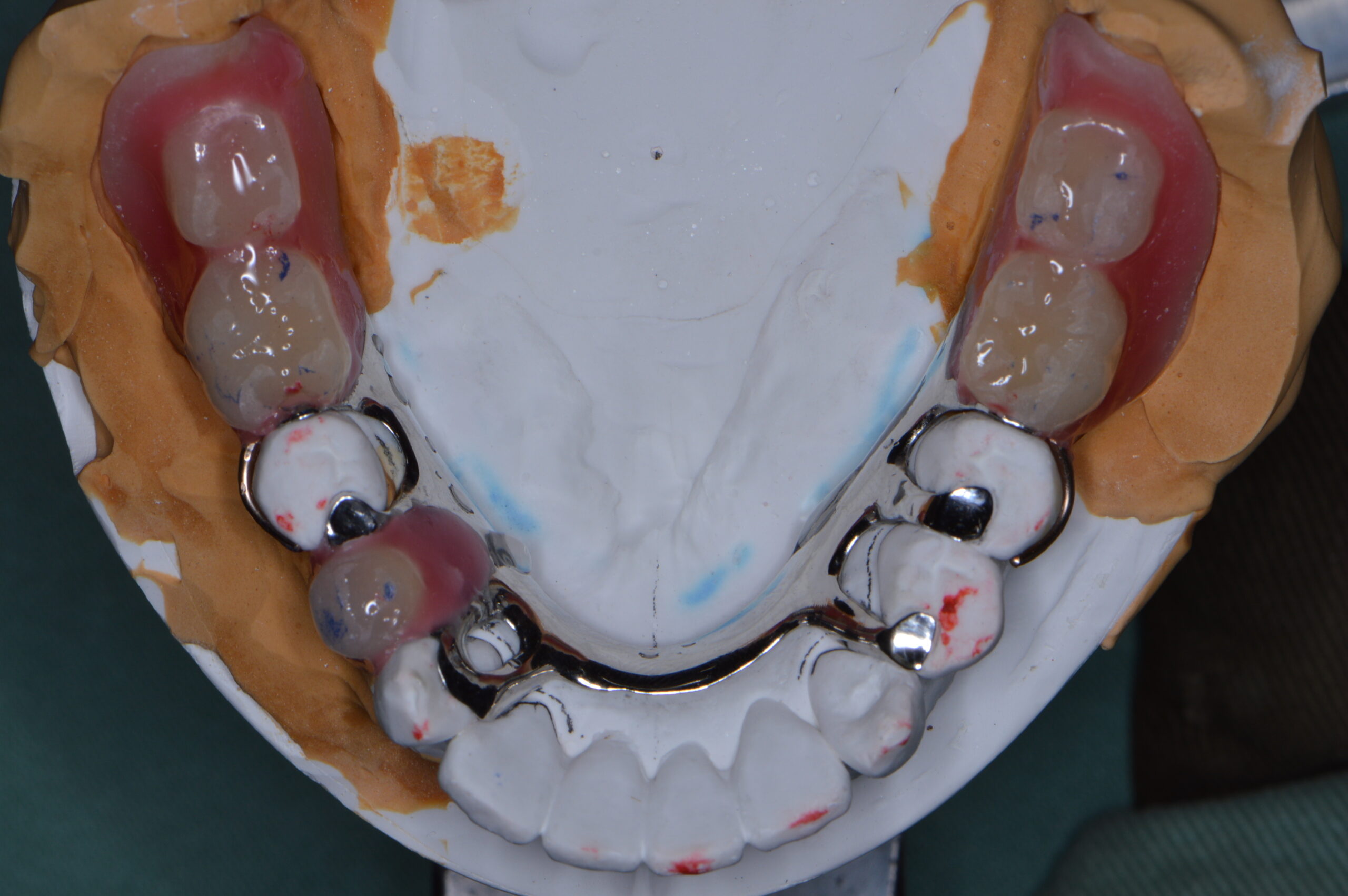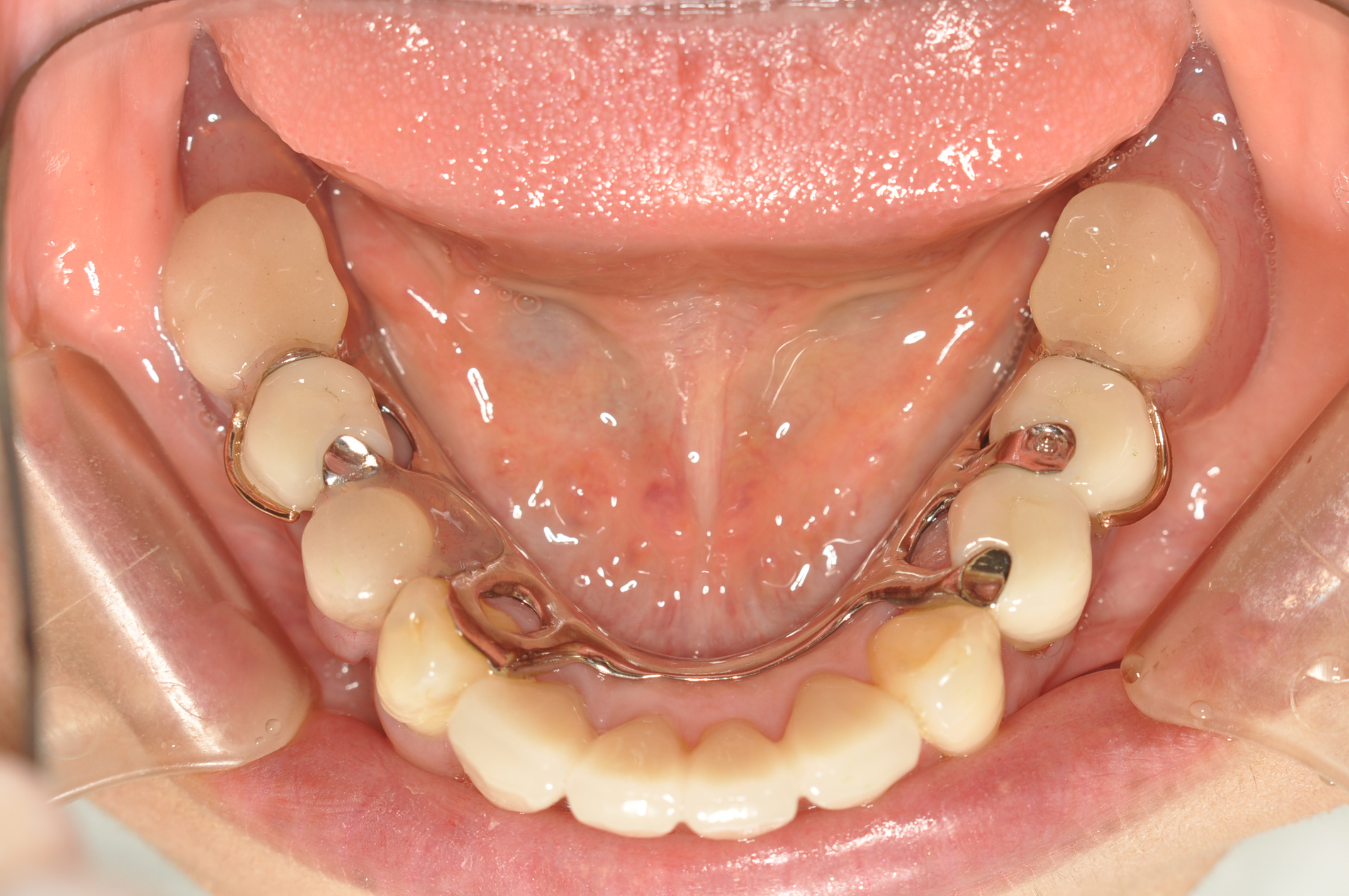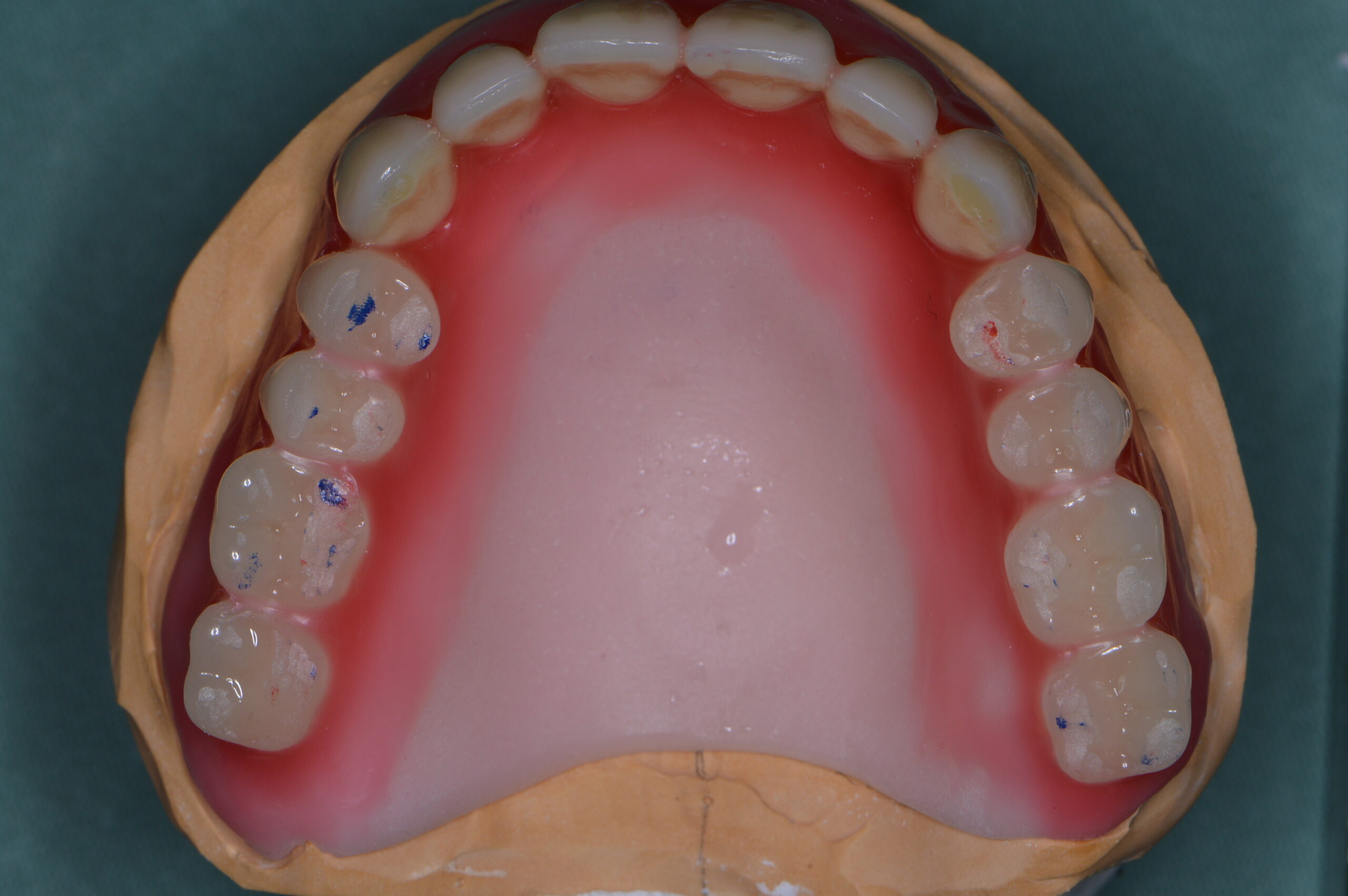 試適咬合調整時。安藤歯科医院では臼歯部人工歯については95%陶歯を使います。なぜならその後の義歯のメインテナンス、修理がしやすいためです。
